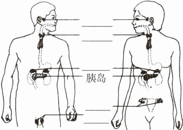 从上到下依次为:垂体、甲状腺、胸腺、肾上腺、睾丸(左)/卵巢(右)