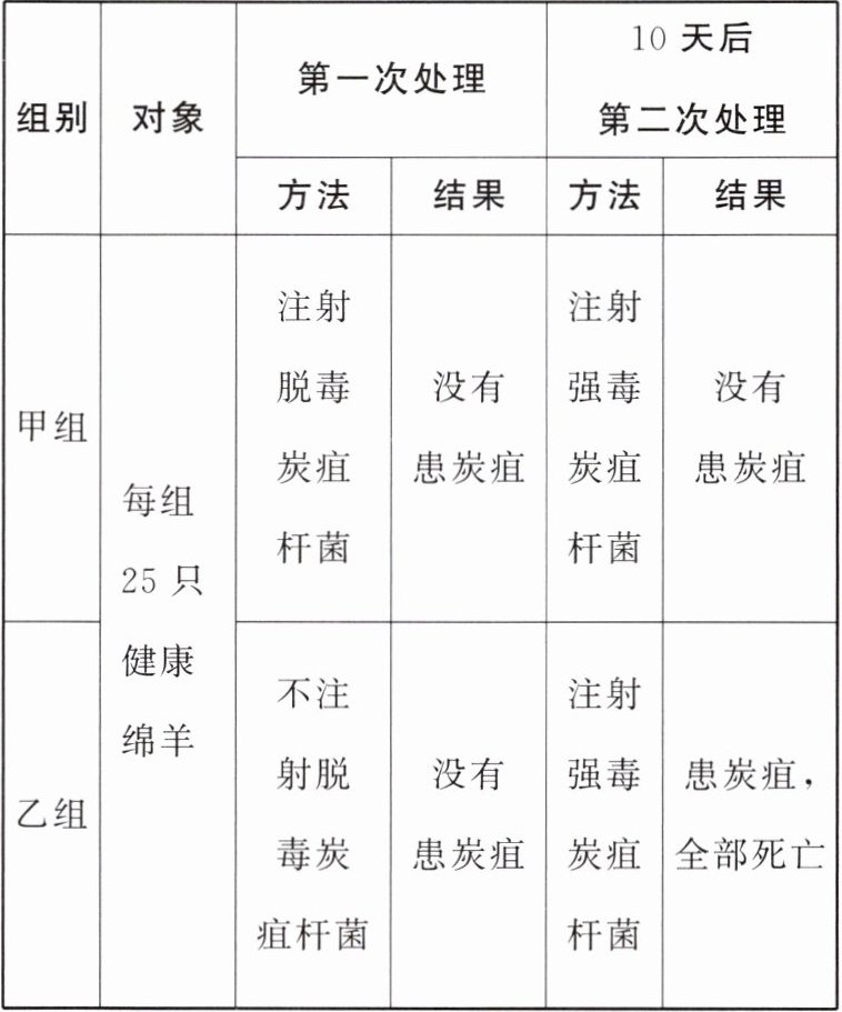 人类对生命世界的认知是在科学探究和实践中不断地修正和深化的。很多科学家作出了重大贡献,其中在疫苗研发过程中,微生物学家巴斯德为了探究注射脱毒炭疽杆菌能否增强绵羊预防炭疽的免疫能力,曾进行了以下实验。