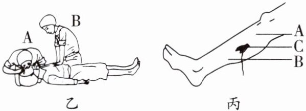 。(3)遇到外伤出血的患者,需要及时止血。图丙所示受伤部位 C 有暗红色的血液缓缓流出,按压止血的部位应该是图中的