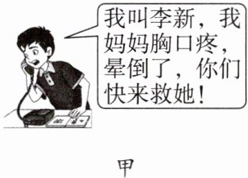 (1)遇到有人晕倒等紧急情况,一定要尽快拨打“120”急救电话。图甲所示李新正在拨打急救电话,他的叙述中缺少的必要信息是