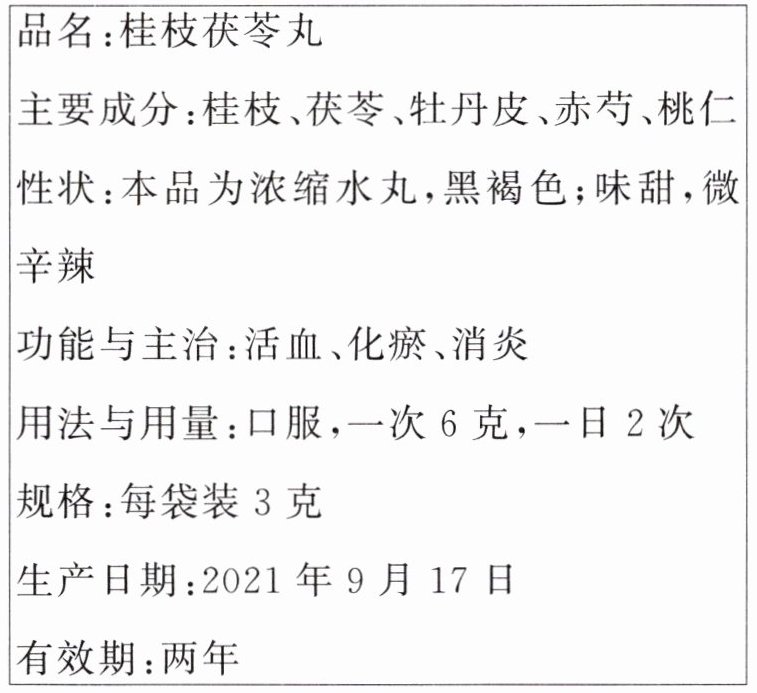。(至少答出两条)(4)某同学在上体育课时不小心摔了一跤,膝盖处有瘀血,该同学自我诊断,到附近正规药房购买了桂枝茯苓丸进行自我治疗,据上述信息可以推断,该药属于______