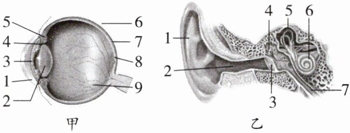 3. 人从外界获取的信息大多数通过眼和耳。如图所示,甲为眼球的结构示意图,乙为人耳的结构示意图。据图回答下列问题: