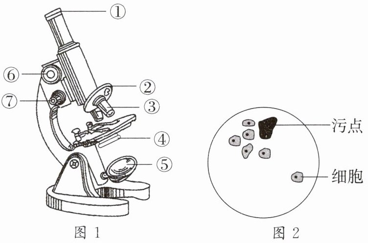 1. 西西在学习了“练习使用显微镜”之后,用显微镜观察细胞玻片。图 1 为显微镜结构示意图,图 2 为显微镜下观察到的视野。请据图回答下列问题: