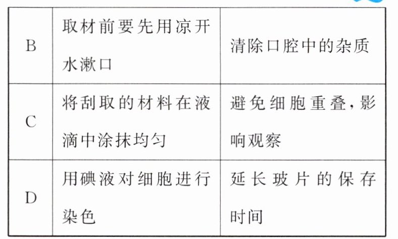 7. 下表是关于制作人的口腔上皮细胞临时装片的步骤及其目的,对应不正确的是(