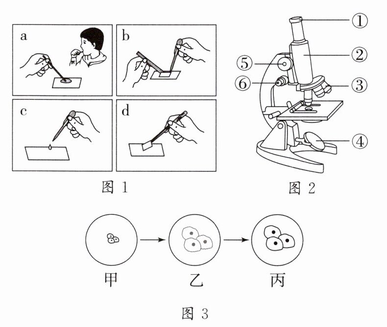 在生物学实验课上,小涵制作人的口腔上皮细胞临时装片(如图 1)后,用显微镜(如图 2)进行观察,观察到的部分视野如图 3 所示。请据图回答下列问题: