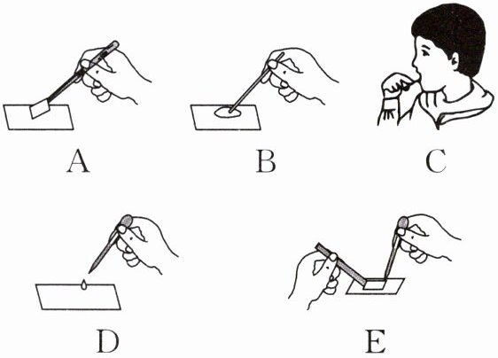 (4)步骤 A 是用镊子夹起盖玻片,使它的一边先接触载玻片上的液滴,然后缓缓放平。这样做可以避免盖玻片下面出现
