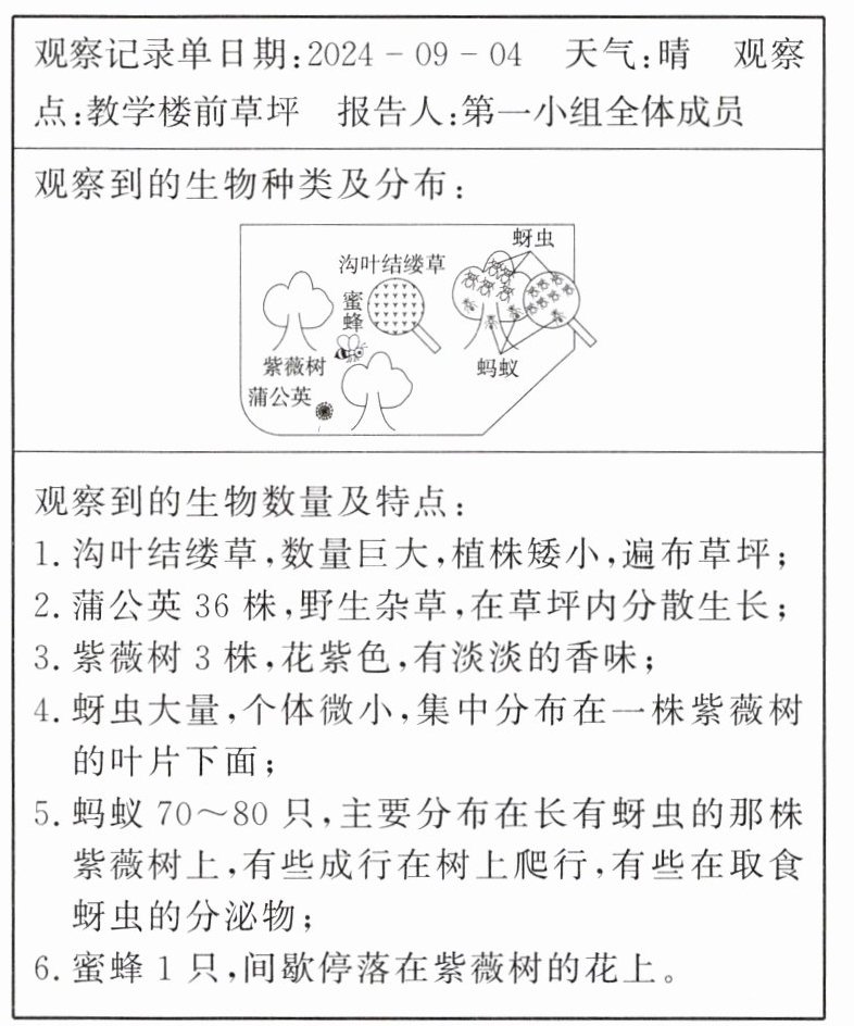 2. 某学校七年级(1)班的学生在老师的带领下观察校园的生物,其中,第一小组的同学做了如下记录: