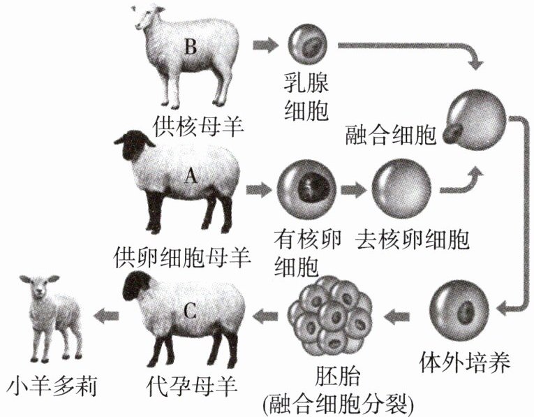 8. 如图为小羊多莉的诞生过程,小羊多莉长相既不像C羊也不像A羊,而与B羊十分相像,是因为多莉从B羊得到了(