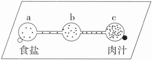 8. 为了探究草履虫能否对外界刺激作出反应,在载玻片的 a、b、c 三处各滴一滴草履虫培养液,并将其连通。a 处边缘放几粒食盐,一段时间后,c 中草履虫数量最多。下列相关叙述错误的是 (