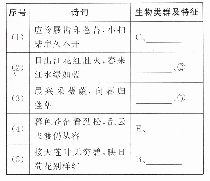 9. 古诗词中蕴含着丰富的生物学知识,彰显出自然之美、生命之美,请将下列诗句中描述的生物类群(用字母表示)及特征(用数字表示)填入相应表格中。