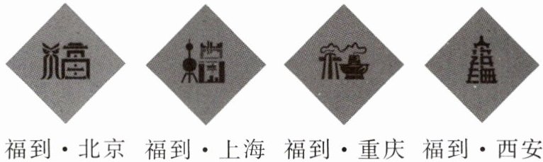 2. 下面图片是一位小伙设计的几个“福”字。“北京福”融合了天安门、故宫和京剧等元素;“上海福”简直就是一张外滩的艺术照;“重庆福”有重庆特色的火锅和交通;“西安福”中兵马俑住进了大雁塔……这些“福”字(