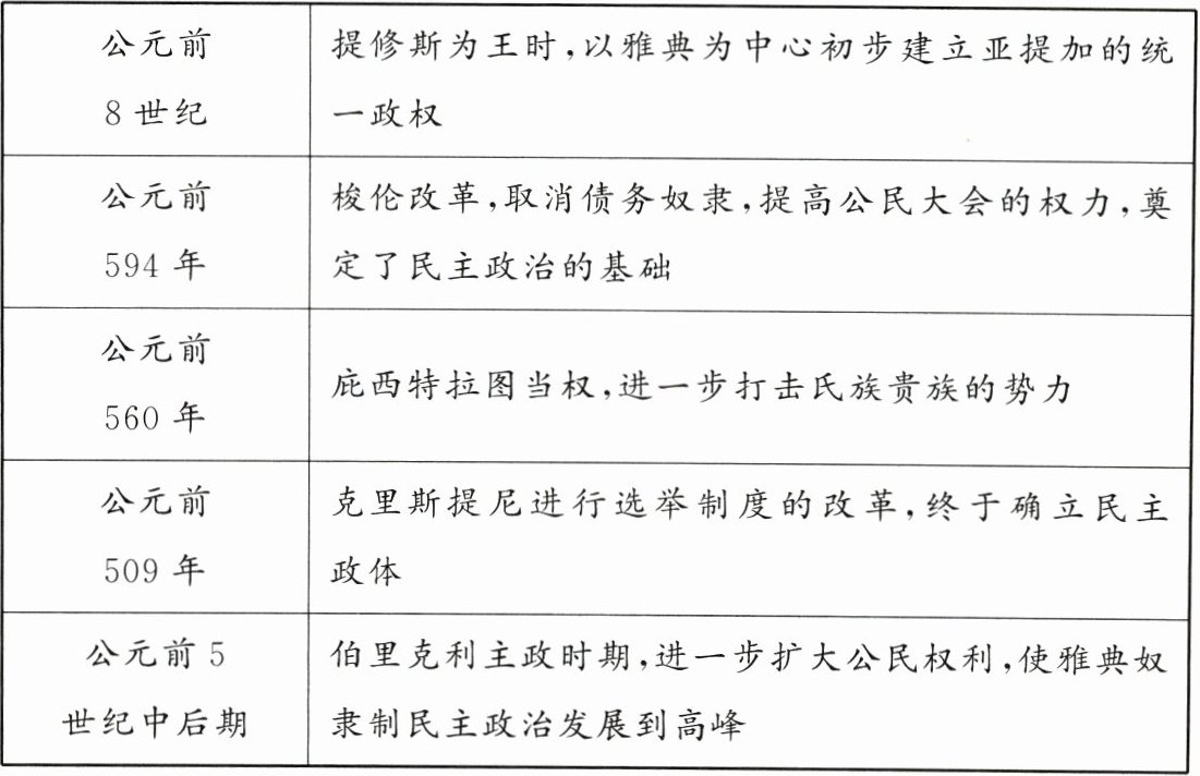 |公元前5世纪中后期|伯里克利主政时期,进一步扩大公民权利,使雅典奴隶制民主政治发展到高峰|