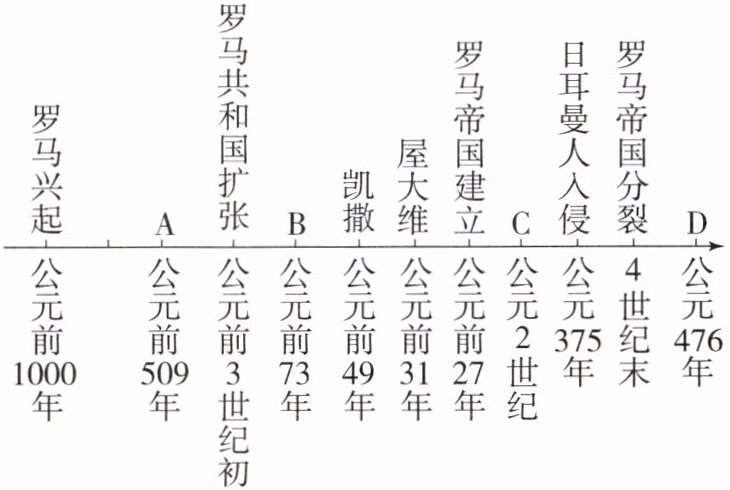 |罗马兴起|A|罗马共和国扩张|B|凯撒|屋大维|罗马帝国建立|C|日耳曼人入侵|罗马帝国分裂|D|