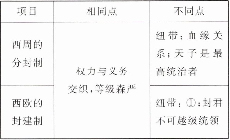 |西周的分封制|权力与义务交织,等级森严|纽带:血缘关系;天子是最高统治者|