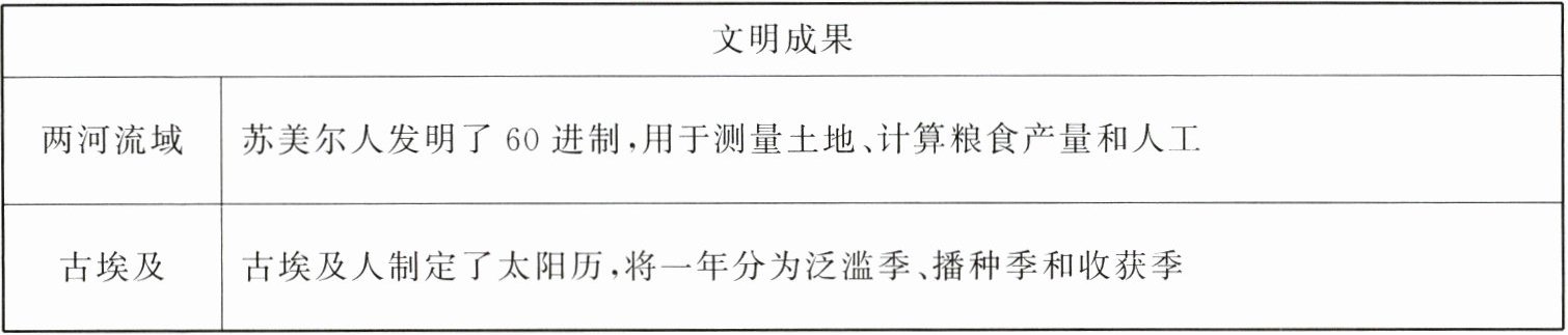 解析:选A。依据题干材料中的“苏美尔人发明了60进制,用于测量土地、计算粮食产量和人工”可以得出,与两河流域文明有利于农业生产的环境有关;依据题干材料中的“古埃及人制定了太阳历,将一年分为泛滥季、播种季和收获季”可以得出,古埃及文明与尼罗河流域的环境有关。所以表格内容说明文明的形成与环境存在联系,A项正确。故选A项。