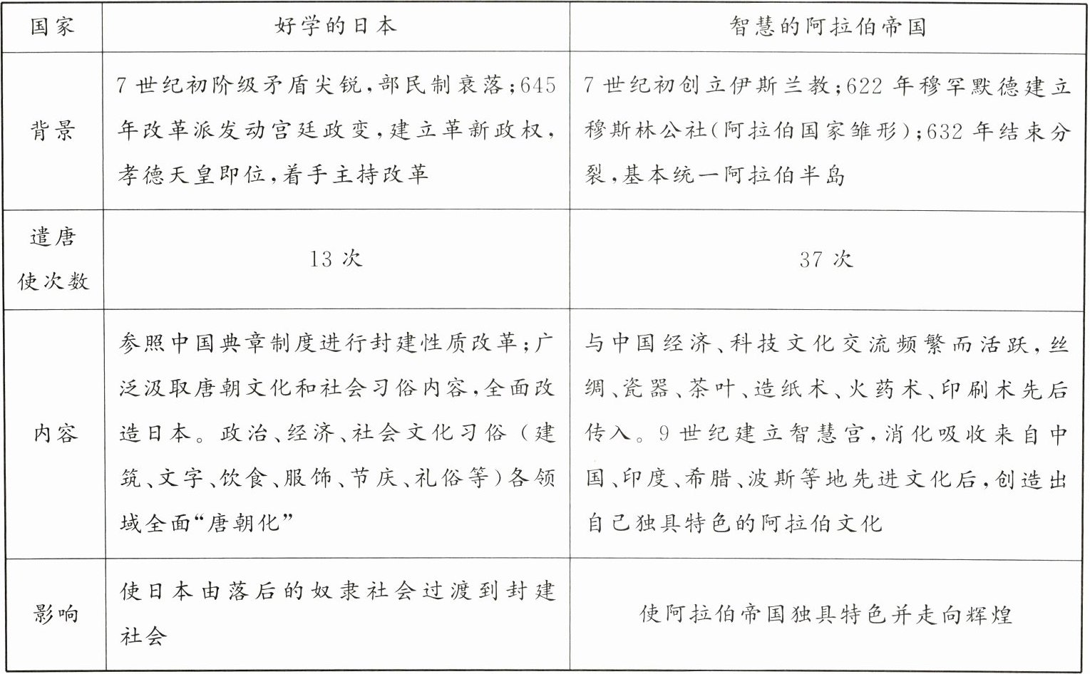 |影响|使日本由落后的奴隶社会过渡到封建社会|使阿拉伯帝国独具特色并走向辉煌|