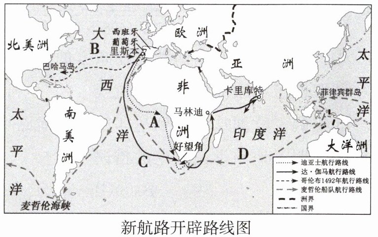 (2)根据材料二,指出完成环球航行的路线和“发现”新大陆的路线。(只写字母)