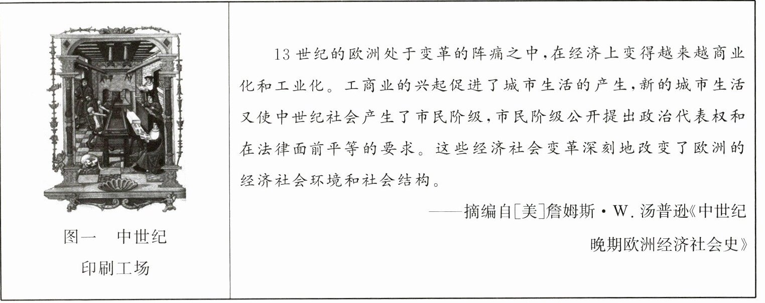 (1) 指出与图一有关的新的生产组织形式。根据材料一, 概括 13 世纪欧洲“经济社会变革”的表现。结合所学知识, 分析这些变革产生的影响。(4 分)