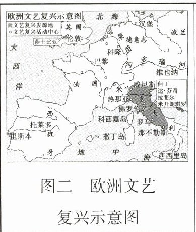 (2) 根据材料二, 概括文艺复兴时期人文主义的内涵。结合所学知识, 请你从图二的人物中任选一个, 列举其代表作。(2 分)