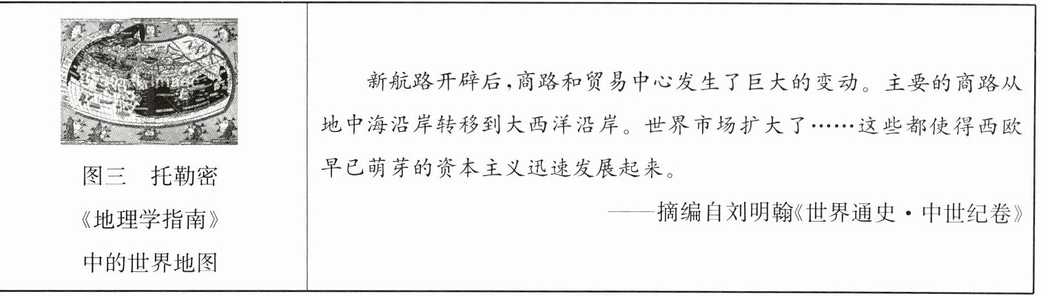 (3) 图三体现出有利于西欧人开辟新航路的条件是什么? 结合所学知识, 谈谈你对材料三中“世界市场扩大了”的理解。综合上述材料, 谈谈你对社会变革的认识。(4 分)