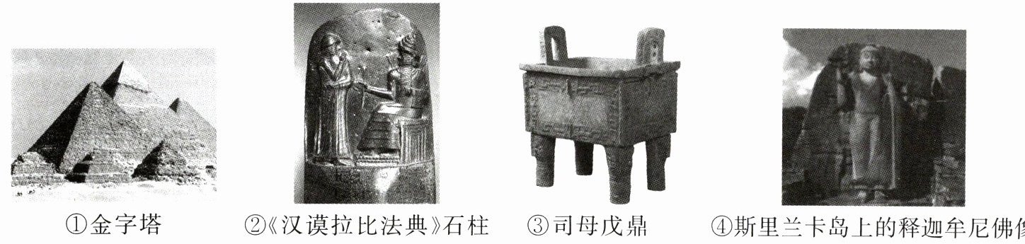 |①金字塔|②《汉谟拉比法典》石柱|③司母戊鼎|④斯里兰卡岛上的释迦牟尼佛像|