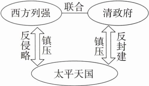 解析:选 D。根据题干“太平天国运动思维导图”信息“西方列强、联合、清政府、镇压”并结合所学知识可知,在太平天国运动中,西方列强利用清政府侵略中国、中外势力勾结联合镇压太平天国,D 项正确;思维导图中没有涉及鸦片战争的信息,排除 A 项;“扶清灭洋”是义和团运动的口号,排除 B 项;思维导图没有呈现天京事变,排除 C 项。故选 D 项。