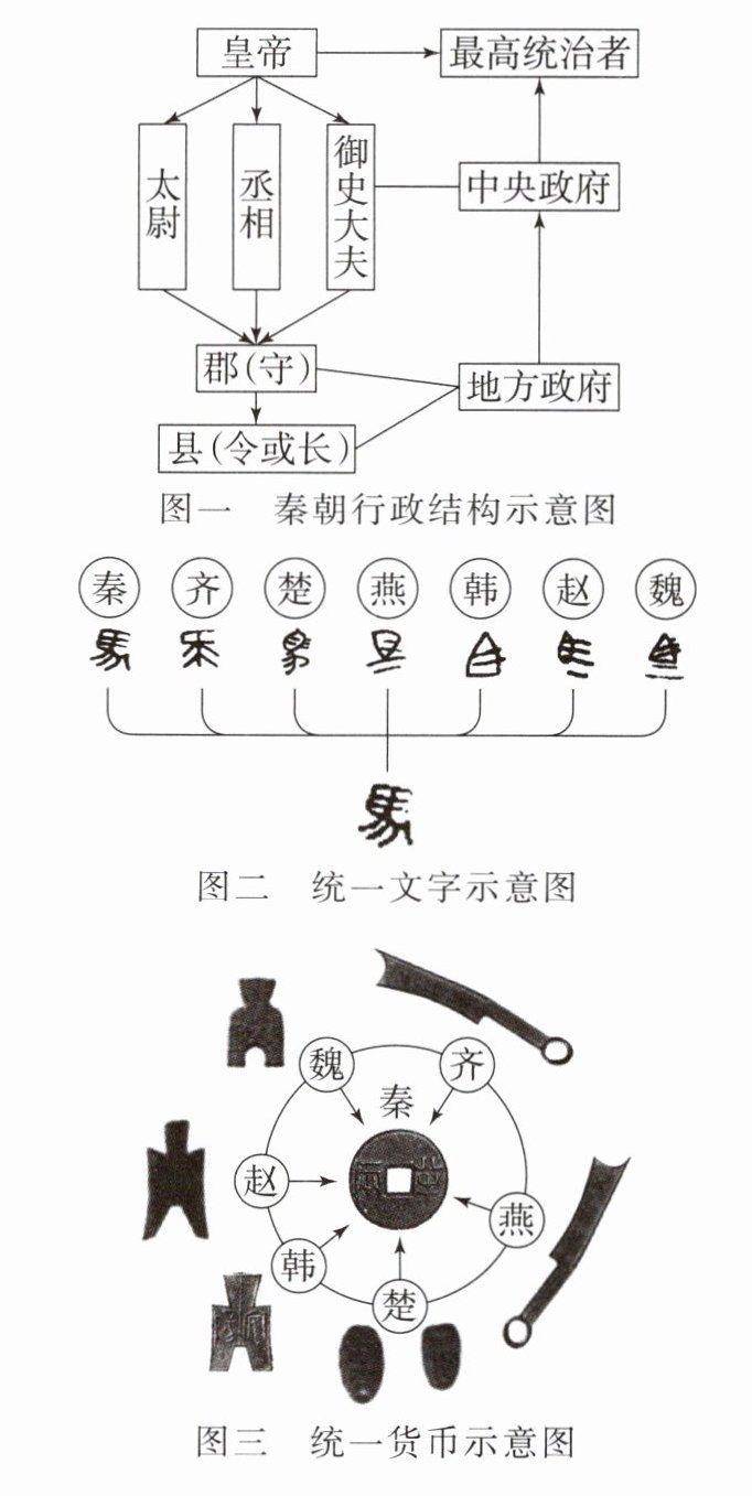 (1)作用:通过设立三公九卿等中央官职,加强中央对地方的控制,巩固了国家的统一;废除分封制,实行郡县制,直接由中央任命官员管理地方,增强了国家的行政效率和统一性。统一文字,推行小篆作为标准文字,促进了文化交流和认同,减少了各地文化差异。统一货币,使用圆形方孔半两钱,便利了经济交流和贸易,促进了经济发展。