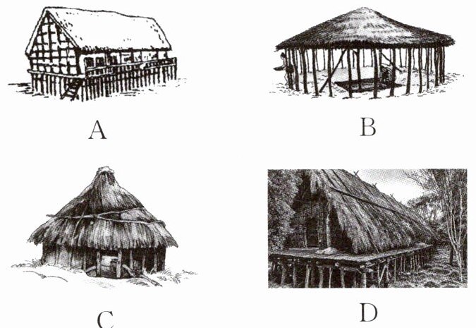 解析:选 B。结合所学知识可知,在河姆渡遗址还发现了木结构水井,这是迄今发现年代最早的木结构水井之一。B 图是木结构水井,B项正确。故选 B项。