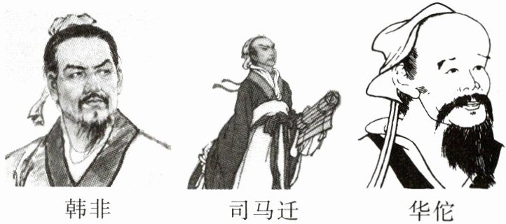 (3)示例一:韩非是法家的集大成者,他反对空谈仁义,强调以法治国,树立君主的权威,建立中央集权专制统治。示例二:司马迁是一位伟大的史学家,他写成我国古代第一部纪传体通史——《史记》,他爱憎分明,秉笔直书,对我国史学产生了深远的影响。示例三:华佗是东汉末年的名医,他擅长针灸、汤药和外科手术;他发明了麻醉药剂"麻沸散",创编"五禽戏",帮助人们强身健体。