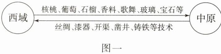(2)根据图一并结合所学知识,分析汉朝时中原与西域交流的特点,并指出这些交流出现的主要原因。(4分)