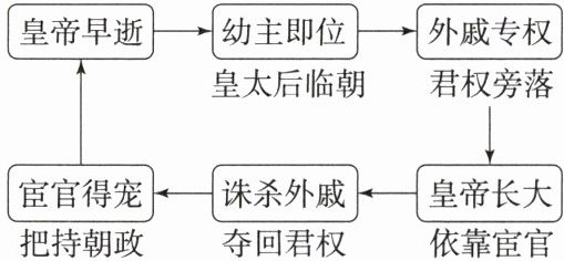 (3)现象:外戚与宦官交替专权。原因:东汉中期以后,继位的皇帝大多年幼,无法主政。影响:这种现象动摇了东汉的统治,使东汉王朝走向衰亡。