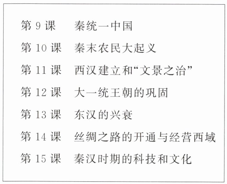 解析:选B。观察题干方框内的内容可知,第9课到第15课的内容与秦汉时期有关,故最合适的主题是统一多民族封建国家的建立和巩固,B项正确。故选B项。