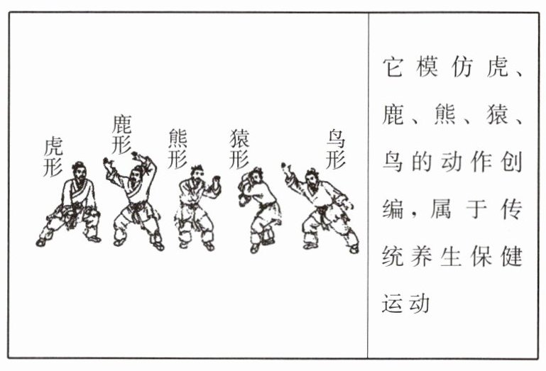 解析:选C。根据材料关键信息"华佗""传统养生保健运动"及图片中人物模仿虎、鹿、熊、猿、鸟的动作并结合所学知识可知,这些内容介绍的是华佗的"五禽戏",练习这些体育动作可以帮助人强身健体,C项正确。故选C项。