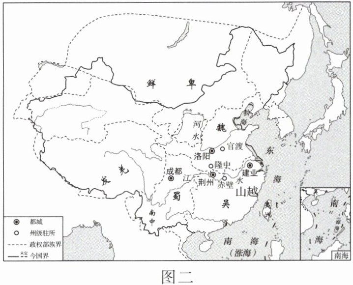 (2)根据材料并结合所学知识指出:图二是什么形势图?什么战役为它的形成起了决定作用?其中蜀国是谁建立的?吴国加强与东南海岛联系的重大事件是什么?