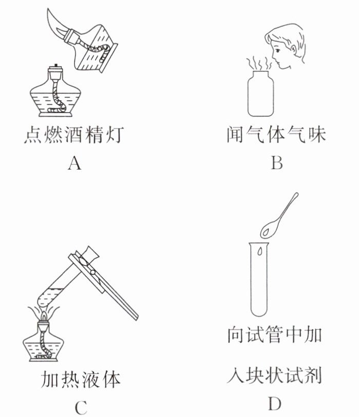 解析:图 A,点燃酒精灯时,应用火柴,不能用燃着的酒精灯引燃,否则易引起火灾。图 B,闻气体气味的方法应为“用手轻轻地在瓶口扇动,使极少量的气体飘进鼻孔”,而不能把鼻孔凑到容器口直接闻,否则可能因吸入较多气体而使人中毒。图 C,给液体加热时应注意:①液体的体积不超过试管容积的$\frac{1}{3}$;②试管夹应夹在距试管口$\frac{1}{4}\sim\frac{1}{3}$处;③试管与水平面成$45^{\circ}$夹角;④用外焰加热,图示中操作正确。图 D,向试管内加入块状试剂时应“一横二放三慢竖”,让块状试剂慢慢滑到试管底部,否则易使试管破裂。答案: