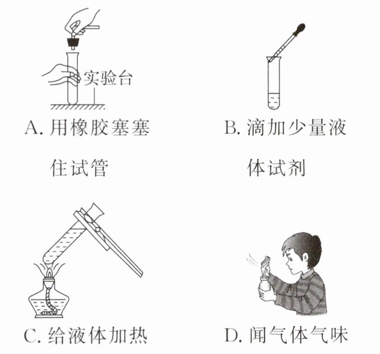 解析:选 D。A. 把橡胶塞慢慢转动着塞进试管口,切不可把试管放在实验台上再使劲塞进塞子,以免损坏试管,图中所示操作错误;B. 使用胶头滴管滴加少量液体的操作,注意胶头滴管不能伸入试管内或接触试管内壁,应垂直悬空在试管口上方滴加液体,防止污染胶头滴管,图中所示操作错误;C. 给试管里的液体加热时,试管里的液体不应超过试管容积的$\frac{1}{3}$,图中所示操作错误;D. 实验中有的气体是有刺激性或有毒的,所以闻气体的气味时,应用手轻轻地在瓶口扇动,使极少量的气体飘进鼻孔;图中所示操作正确。故选 D。