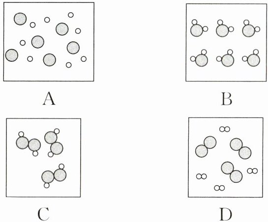 解析:选 B。水分子是由 2 个氢原子和 1 个氧原子构成的。A.图中表示的是氢原子和氧原子,故不符合题意;B.图中表示的物质分子是由2 个氢原子和 1 个氧原子构成的,是水分子,符合题意;C.图中表示的物质分子是由 2 个氢原子和 2 个氧原子构成的,故不符合题意;D.图中表示的物质分子是由两种分子混合而成的,故不符合题意。故选 B。