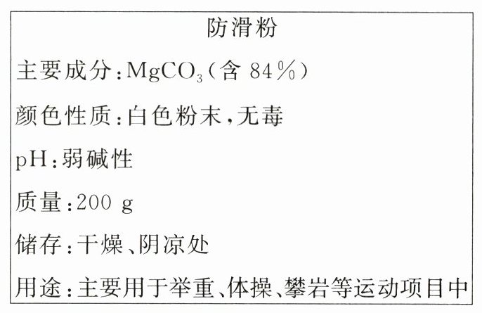 22. 在运动赛场上,有一种白色粉末常常在体操、羽毛球中出镜,在举重比赛中,也会见到它的身影,这就是防滑粉。防滑粉的主要成分为碳酸镁,有吸水性。如图是一袋防滑粉的标签,请根据标签回答问题: