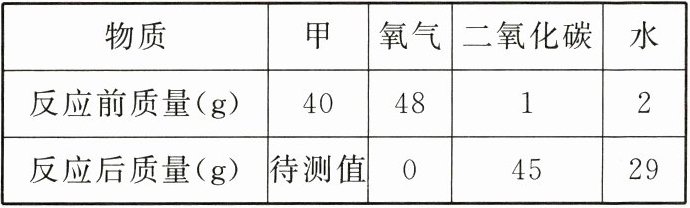 解析:选 B。根据质量守恒定律可知,反应前后物质的总质量相等,氧气的质量减少,则氧气为反应物,二氧化碳和水的质量增大,则二氧化碳和水为生成物,待测值为(40+48+1+2)-(0+45+29)=17,该反应为甲和氧气反应生成二氧化碳和水。A.二氧化碳和水均为化合物,则该反应不属于置换反应,故A错误;B.由分析可知,待测值等于17,故B正确;C.该反应的生成物有水和二氧化碳,氧气是反应物,故C错误;D.参加反应的二氧化碳和氧气的质量比为44:48,故D错误。故选 B。