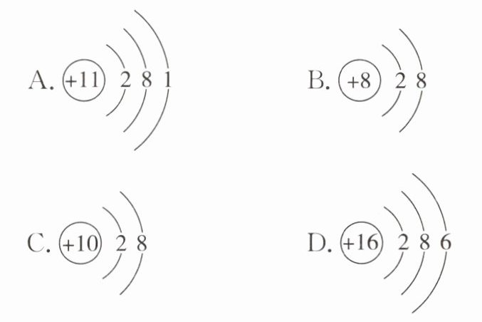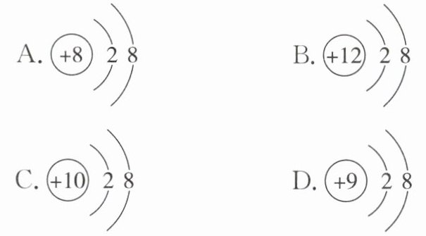 解析:选C。从结构示意图可以看出,该粒子有两个电子层,A正确;圆圈内的数字即核电荷数,B正确;核外电子数为10,C错误;最外层电子数为8,具有相对稳定结构,D正确。