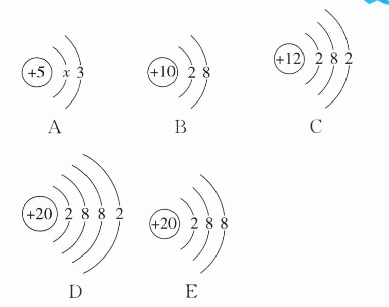 6. 原子结构的探索过程经历了道尔顿原子模型→汤姆孙原子模型→卢瑟福原子模型→玻尔原子模型→电子云模型的阶段。现在常用原子结构示意图表示核外电子的分层排布。如图是A、B、C、D、E五种粒子的结构示意图,回答下列问题: