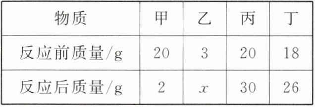解析:选 C。A. 根据反应物的质量总和等于生成物的质量总和可知,20+3+20+18=2+x+30+26,解得 x=3,故 A 正确;B. 甲反应后质量减小,为反应物;丙、丁反应后质量增大,为生成物;乙的质量不变,可能为催化剂,也可能未参与反应,该反应符合"一变多",属于分解反应,故 B 正确;C. 乙的质量不变,可能为催化剂,也可能未参与反应,故 C 错误;D. 该反应中甲、丁的质量比为(20 g-2 g):(26 g-18 g)=9:4,故 D 正确。故选 C。