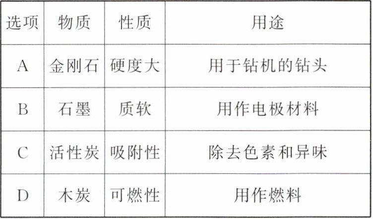 解析:选 D。A. 由于碳原子的排列方式不同,金刚石和石墨的物理性质存在明显差异,金刚石的硬度很大,石墨的质地软,故 A 不符合题意;B. 金刚石的硬度很大,不能用于制造铅笔芯,石墨的质地软,可用于制造铅笔芯,故 B 不符合题意;C. 纯净的金刚石是无色透明的固体,故 C 不符合题意;D. 常温下碳单质的化学性质都不活泼,故 D 符合题意。