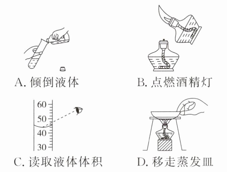 解析:选 A。A. 向试管中倾倒液体时,瓶塞要倒放在实验台上,标签要对准手心,瓶口紧挨试管口,图中所示操作正确。B. 点燃酒精灯时禁止用一只酒精灯去引燃另一只酒精灯,图中所示操作错误。C. 量取液体时,视线应与液体凹液面的最低处保持水平,图中俯视刻度,操作错误。D. 正在加热的蒸发皿温度较高,不能用手直接拿热的蒸发皿,应用坩埚钳夹取,图中所示操作错误。