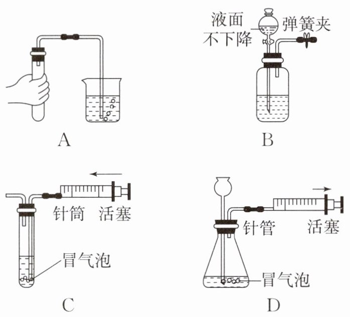 解析:选 C。A. 密闭体系中,加热空气从而产生压强差,进行装置气密性检验,A 正确;B. 用弹簧夹夹紧橡胶管,形成密闭体系。长颈漏斗下端与液面形成液封,若装置气密性良好,长颈漏斗中的水不会下降,B 正确;C. 该装置不是密闭体系,所以无论装置是否气密性良好,长导管下端管口处都会出现气泡,C 错误;D. 长颈漏斗下端与液面形成液封,若装置气密性良好,向外拉活塞,会抽出锥形瓶中的气体,从而形成压强差,从而使长颈漏斗下端产生气泡,D 正确。