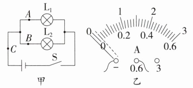 (选填“A”“B”或“C”)处。(3)若要测量A处的电流,连好电路闭合开关前,发现电流表指针位置如图乙虚线所示,则接下来的操作是