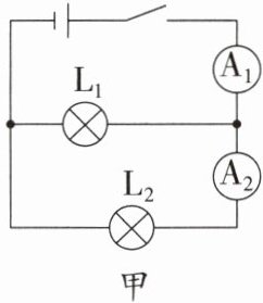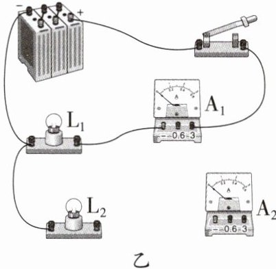 7. 根据如图甲所示的电路将图乙中的实物用笔画线代替导线连接完整。(电流表$A_1$的示数是0.9A,电流表$A_2$的示数是0.4A)