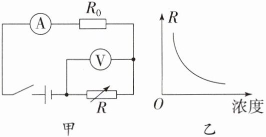 4. 控制大气污染物浓度是确保空气质量,实现碧水蓝天的重要措施。如图甲所示是物理学习小组设计的大气污染物浓度监测简化电路。当污染物浓度增大时,污染物浓度监测表的示数增大;$R$为气敏电阻,其阻值随污染物浓度变化的关系如图乙所示。下列说法正确的是(