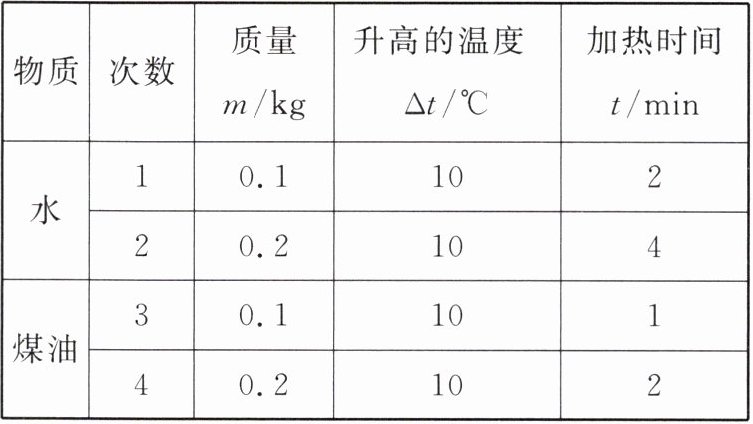 3. 某同学在做“比较不同物质的吸热能力”的实验时,使用相同的电加热器给水和煤油加热,得到的实验数据如下表。