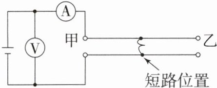 7. 在相距$15km$的甲、乙两地之间有两条输电线,已知每$1m输电线的电阻为0.01\Omega$,现输电线在某处发生短路,为确定短路位置,检修员利用电压表、电流表和电源接成如图所示电路进行检测。当电压表的示数为$6V$时,电流表的示数为$0.06A$,则甲地到短路位置之间的输电线总阻值为